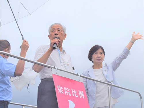 JUGEMテーマ:共産党(日本共産党) 日本共産党の白川よう子衆院比例予定候補は9月25日、島勝之市議予定候補とともに四国中央市のスーパー・ハローズ土居店前で街頭演説し、「政治を国民の手に取り戻そう」と総選挙と四国中央市議選の勝利に向けた支援を呼びかけました。今期で勇退する青木永六市議も参加しました。 市議選(11月8日告示)で日本共産党は、三好ひとし市議、ひだかゆうすけ市議、島候補の3氏が立候補を予定し、現有3議席確保をめざします。 島さんは、旧土居町地域が抱える問題として、...