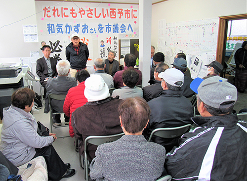 JUGEMテーマ:共産党(日本共産党) 50人が参加した事務所開きで決意を語る和気氏(8日、西予市) 日本共産党の和気かずお西予市政対策委員長(市議候補)の事務所開きが8日、西予市野村町野村12の349の2の事務所で行われ、50人が参加。「上に向かってものを言う議員が必要」などと激励が相次ぎました。市議選(定数3減の18)は、4月19日告示(26日投票)です。 和気氏は「人はすべて平等だと言い、正しいことを貫くのが日本共産党であり、だからこそ自分は入党した。災害やコロナウイルス問題...