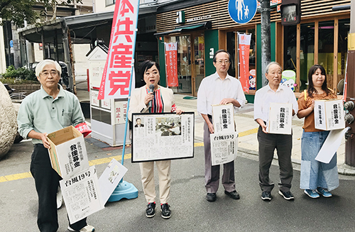 JUGEMテーマ:共産党(日本共産党) 松山市で救援募金を呼びかける日本共産党県委員会と中予地区委員会(14日) 日本共産党県委員会と中予地区委員会は14日、松山市千舟町の商店街で、台風19号災害救援募金に取り組みました(上写真)。祝日のため小・中学生や親子連れの通行者が多く、次々に足を止めて募金していました。 「しんぶん赤旗」掲載の日本共産党台風19号災害対策本部の記事をパネルにして掲げ、林紀子県委員長、植木正勝地区委員長らがマイクで募金への協力を訴えました。 ベ...