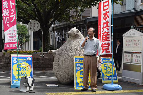 JUGEMテーマ:共産党(日本共産党) 消費税10%増税を中止し、5%に戻すよう訴える植木中予地区委員長(11日、松山市) 日本共産党県委員会と中予地区委員会は11日、松山市千舟町の商店街で党四国ブロック一斉宣伝に取り組み、消費税10%増税の中止と5%への減税を呼びかけました。10%増税に関するシール投票を呼びかけると、高校生や主婦、会社員など様々な市民が応じていました。 植木正勝中予地区委員長は「国民の多くが増税は許せないと反対の声を上げている。いまでさえ賃金が上がらな...