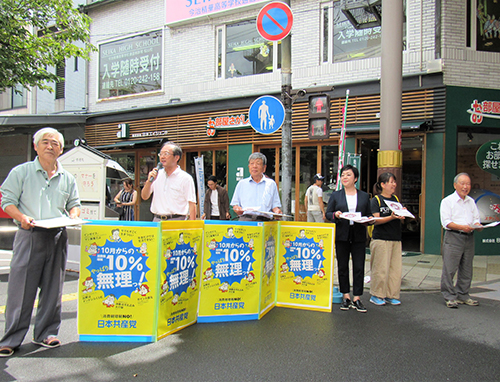 JUGEMテーマ:共産党(日本共産党) 「10月からの消費税増税10%やっぱり無理っ!」とのプラスターを設置し、訴える日本共産党県委員会(7日、松山市) 日本共産党の「10月消費税10%ストップのための全国いっせい宣伝行動週間」(2日〜9日)の7日、党県委員会と中予地区委員会は松山市千舟町の商店街で宣伝。「10月からの消費税増税10%やっぱり無理っ!」との新しいプラスターを設置し、「しんぶん赤旗」9月号外を配布。10月からの消費税増税中止を求める署名を市民に呼びかけました。 ...