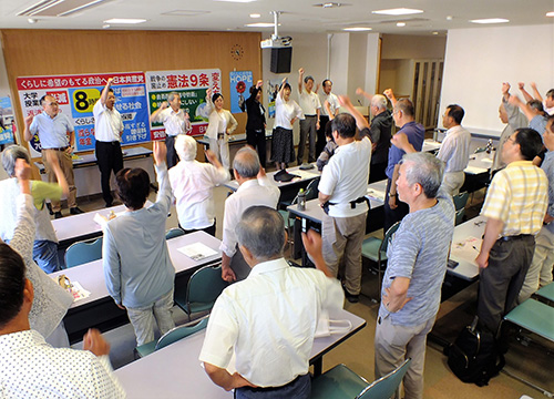JUGEMテーマ:共産党(日本共産党) 「ガンバロー」を三唱して必勝の決意を固め合う参加者(4日、松山市) 日本共産党参院選出発決起集会(同党県委員会・中予地区委員会主催)が公示日の4日、松山市のコムズで開催され、50人が参加。林紀子県委員長は「参院選は、日本の命運がかかった政治戦。小池晃書記局長の年金問題追及の反響など論戦に確信を持ち、安倍自公政権に審判を下すために最後までがんばり抜こう」と訴えました。 林県委員長は「すべての党員と党後援会員、支持者が参院選を我...