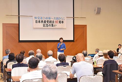 JUGEMテーマ:共産党(日本共産党) 「1強政治では絶対だめ。愛媛中を歩き、がんばり抜く」とあいさつする永江参院議員(8日、松山市) 「党史上未踏の道の探求、世界でもユニークな探求の道、野党連合政権に向けた話し合いを開始しよう」――。日本共産党創立97周年のつどいが8日、松山市のコミュニティセンターで開かれ、65人が参加。参加者は、野党連合政権実現と、その最大の力である強く大きな党建設に向けて決意を固め合いました。参院選愛媛選挙区で勝利した永江孝子参院議員、林紀子党県委...