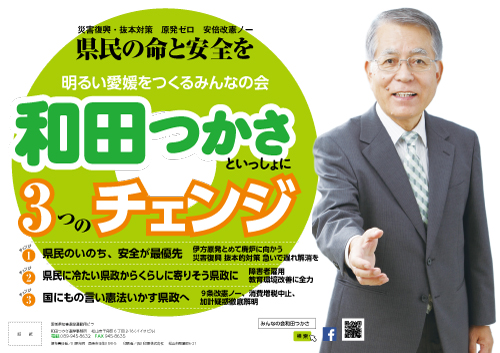JUGEMテーマ:共産党(日本共産党) 愛媛県知事選挙は11月18日まで毎日投票できます。和田つかさ候補で、愛媛県政を3つのチェンジ! 和田つかさ候補のチラシをご覧ください。 画像をクリックするとPDFでご覧いただけます。 【表面】 【裏面】