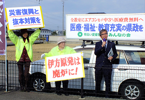 JUGEMテーマ:共産党(日本共産党) 和田候補への支持を呼びかける宮本衆院議員と松田市議、秋本県議予定候補(4日、今治市) 日本共産党の宮本岳志衆院議員は4日、今治市3カ所と松山市で街頭演説。今治市では、松田澄子市議と秋本けいこ県議候補とともに、加計疑惑の徹底解明を訴え、県民に顔を向けた県政実現へ三つのチェンジをめざす和田つかさ候補への支持を呼びかけました。さいさいきて屋前には、30人の聴衆が集まり、共感の拍手を送っていました。 宮本氏は、加計孝太郎理事長の今治...