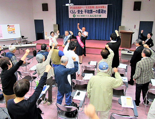 JUGEMテーマ:共産党(日本共産党) 決起集会で、参加者とともにガンバローを三唱する井谷、和田、かたひら、林氏ら(10月24日、新居浜市) 日本共産党新居浜市委員会は10月24日、新居浜市の市民文化センターで、みんなの会の和田つかさ知事予定候補を迎えて決起集会を開催し、55人が参加。新居浜市議選で2議席確保をめざす井谷ゆきえ市議、かたひらえみ党市女性・青年相談室長の2人の市議予定候補が訴え、林紀子党県委員長が第5回中央委員会総会報告をしました。 和田氏は「県民の命と安全...