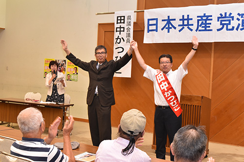 JUGEMテーマ:共産党(日本共産党) 参加者の声援に応える(左から)宮本衆院議員、田中県議(9日、松山市) 「来年の統一地方選・県議選、参院選で田中かつひこ県議、仁比聡平参院議員の再選を必ず」――。宮本岳志衆院議員を迎えて日本共産党演説会が9日、松山市のコミュニティセンターで開かれ、200人が参加。宮本氏と田中県議が訴えました。宮本氏の「国民犠牲、嘘と強権の安倍政権を打倒するには、日本共産党の躍進と野党共闘の勝利しかない」との訴えに、参加者から共感の大きな拍手が送ら...