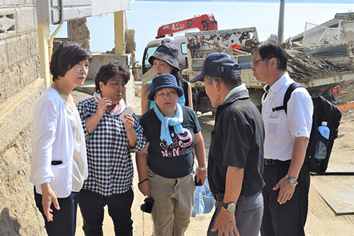 JUGEMテーマ:共産党(日本共産党) 今治市吉海町泊(大島)の被災地で住民から話を聞く白川さんら(7月20日) 日本共産党の白川容子四国ブロック国政対策委員長は7月20日、西日本豪雨で土砂崩れが発生し、海沿いの斜面一帯の住宅が巻き込まれ、女性(67)が死亡した今治市吉海町泊(大島)の被災地を調査。秋本けいこ県議予定候補、松田澄子市議らが同行しました。 土砂やがれきを重機で撤去する作業が進んでいますが、地元業者が自主的に行っているもの。社長(48)は「市は『私有地の土砂...