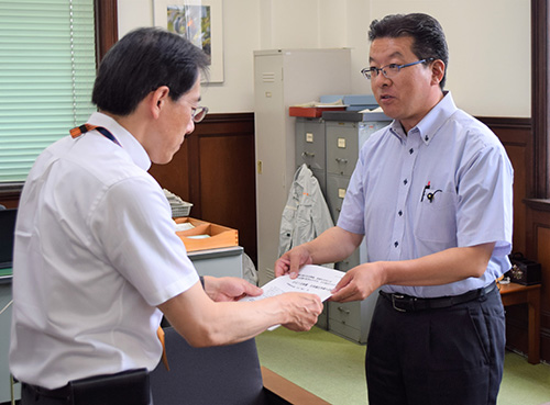 JUGEMテーマ:共産党(日本共産党) 日本共産党県委員会豪雨災害対策本部の林紀子本部長(県委員長)と石本憲一書記長らは7月27日、西日本豪雨災害の義援金の1次分を宇和島市、西予市、大洲市、今治市、鬼北町、松野町の4市2町に、合わせて450万円を届けました。宇和島市は坂尾真市議、大洲市は梅木かづこ市議、今治市は松田澄子市議、西予市は和気数男党市委員会副委員長が同席しました。 宇和島市では、岡原文彰市長が応対。断水解消に向けて代替浄水施設の設置工事が始まり、「復旧に1年はかかると言...
