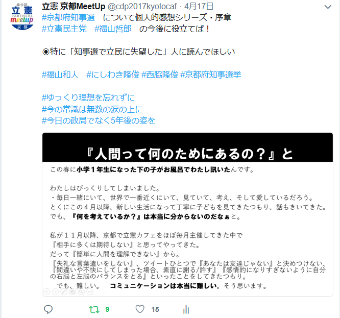 JUGEMテーマ:立憲民主党 Twitterに掲載していた「京都府知事選の感想シリーズ」 活動復活希望の方いたらコメントどうぞ❤ 活動(Twitterでの発信&Meetup開催)は2017年8月まで停止中。 特定の方から活動継続の妨げ、京都府知事選の感想削除の強い内容があり 怖くなってしまい私が疲れてしまったからです。