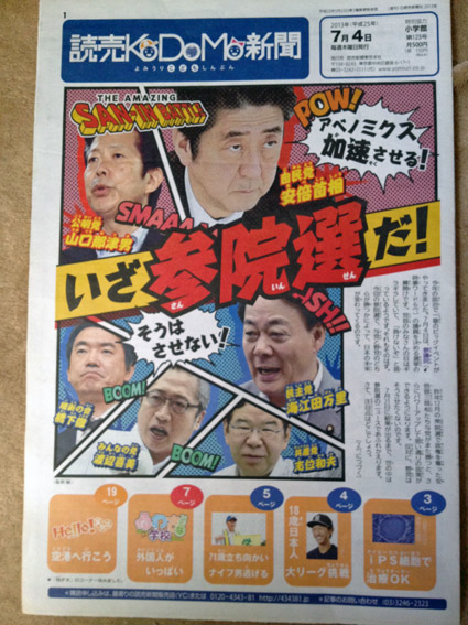JUGEMテーマ:選挙 読売KODOMO新聞 第124号が2013年7月4日(木)に発行されました。 今年の政治で一番のビッグイベント「参議院議員選挙」がやってまいりました! 与党と野党のどちらが勝つかによって日本の未来が変わってくるのです。 7月21日に結果が出るまで世の中は参院選のニュースであふれかえるでしょう。 読売KODOMO新聞のホームページはコチラ イラスト:ハマダミノル 今週の「わかったぞ!」は社会です。 お赤飯について学習します。 「わかったぞ!」のホームページはコチラ ...