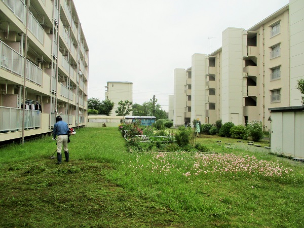 第2回目の草刈を行いました。 朝の草の状態。 まだボウボウではないが、そろそろ夏特有の草が主流になっています… これがやっかい… パヤパヤしてる草… 刈りづらいのよね〜。 今回の草刈隊は4名。 着々と準備を進めます… さぁ、始めますよ! まずは14棟の裏。 ここはそれほど草の量も多くないので楽勝。 15棟に来ました… このパヤパヤした草… これがクセもんでして… ...