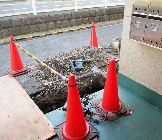 念願の汚水管工事が始まりました。 15棟はエレベーターが設置されていないので汚水管は昔のまんま。 老朽化が激しく、汚水が漏れてしまい、結果、汚水管が詰まるという症状を頻繁に 繰り返す事態に…。 そこで、ようやく、汚水管を全く新しく付け替える工事が行われる運びとなりました! 今日は、カッターで舗装面を切っていきます。 各階段、順調に進んでおります。 こんな感じです。 これを掘り返していくのですね。 工事期間は1週間… よ...