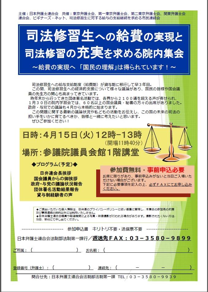 いよいよ明日4月15日は院内集会です! 与党でも議論が活発になってきており、非常に重要なイベントになります。 多くの方のご参加が必要です。 是非よろしくお願いいたします! --------------------------- 司法修習生への給費の実現と充実した司法修習を求める院内集会 〜給費の実現へ「国民の理解」は得られています!〜 2014年4月15日(火) 12時〜13時(開場:11時40分) 参議院議員会館1階講堂 参加費無料 主催:日本弁護士連合会 共催:東京弁護士会、第一東...