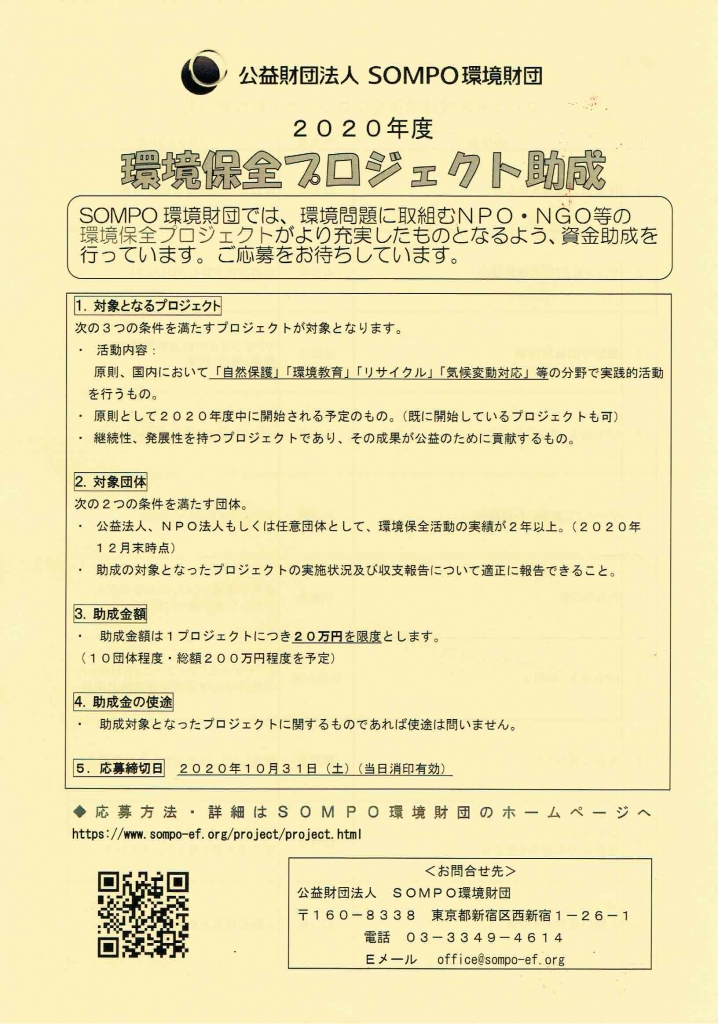JUGEMテーマ:助成金 SOMPO環境財団では、環境問題に取組むNPO・NGOや任意団体の環境保全プロジェクトが、 より充実したものとなるよう資金助成を行います 1. 対象となるプロジェクト 次の3つの条件を満たすプロジェクトが対象となります。 ? 活動の内容 原則として、国内において「自然保護」「環境教育」「リサイクル」「気候変動対応」など広く環境に関する分野で、実践的活動や普及啓発活動を行うもの ? 原則として2020年度中に開始予定のもの(すでに開始されているプロ...