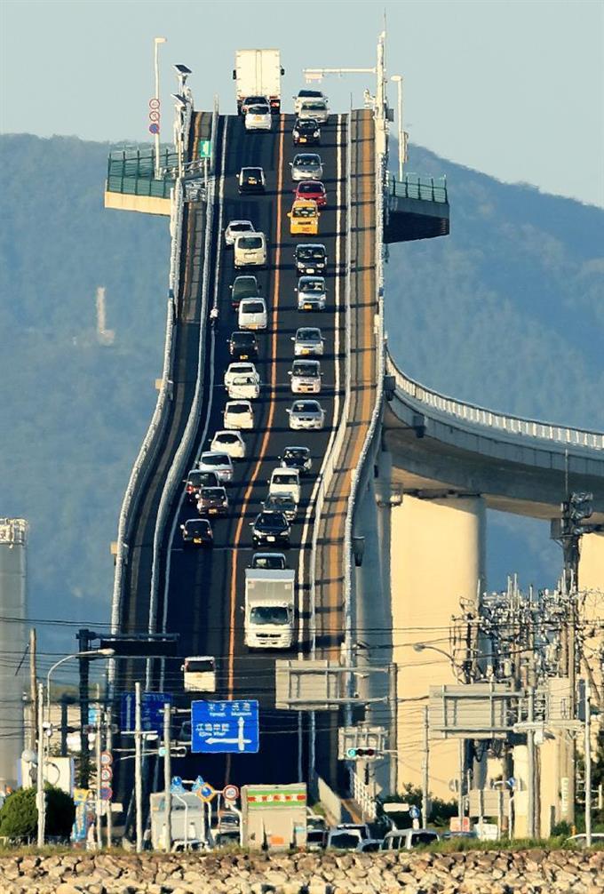 超望遠レンズで見た江島大橋。壁のような路面に自動車がはり付いていた =島根県松江市(古厩正樹撮影) 直立した細長い“壁”を列をなした車が登っていく。目をこらすと懸命に自転車をこぐ人もいる。超望遠レンズで見た光景は、まるでトリックアートのようだった。 鳥取県境港市と、中海に浮かぶ島根県松江市の江島を結ぶ「江島大橋」。全長1.7キロ、海面からの高さ44.7メートル。日本海側の物流拠点・境港と島根県東部地域の交通円滑化を目的に平成16年に完成した。勾配は島根県側で6.1%、1...