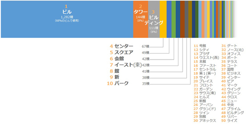 東京スクエアガーデン、東京ガーデンテラス、品川シーズンテラス、テラススクエア――。東京都心部で次々と大規模オフィスビルが完成している。ただ、どのビルの名前もなんとなく聞いたことあるようなものばかり。どれもこれも似通っていて、ぼんやりしていると行き先のビルを間違えてしまうこともありそうだ。 オフィス仲介大手の三幸エステートが7月10日、「オフィスビル名称の傾向分析」と題したレポートを発表した。東京23区内に立っている基準階面積200坪以上の大規模オフィスビル1881棟と、同50坪以上200坪未満の大型・中型ビ...