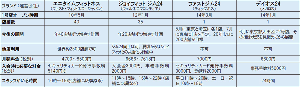 24時間営業のフィットネスクラブが都市部で急増している。プールやスタジオがなく、マシンを使ったトレーニングに特化しているので施設は小規模。割安な料金で好きな時間に使い放題である点が、働き盛りの20〜40代に支持されているのだ。 ブームに火を付けたのは米国の「エニタイムフィットネス」。10年5月に日本に上陸し、首都圏と関西で計40店舗を出した。後を追う独立系の「ジョイフィット ジム24」も全国に35店舗を展開している。 数十台のトレーニングマシンが並ぶ室内では、入れ代わり立ち代わりやってくる利用者たち...