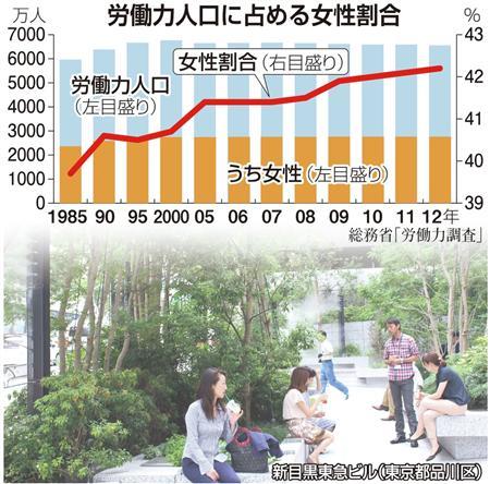 大手不動産各社が都心のオフィスビル開発で、ワーキングマザーら働く女性のニーズを反映させる動きが広がっている。雇用者に占める女性の割合が増加傾向なのに加え、政府が女性活用を成長戦略の柱に据えたことで、今後は出産後も働く女性の数が増える見込みだ。企業テナント誘致で「女性に優しいオフィス」を付加価値に競争力を高める狙いがある。 1月下旬の平日ランチタイム、東京都港区の六本木ヒルズの一角に、周辺のオフィスに勤める働く母親たちが集まった。昼食をとったり簡単なお菓子作りをしたりしながら、リフレッシュ...