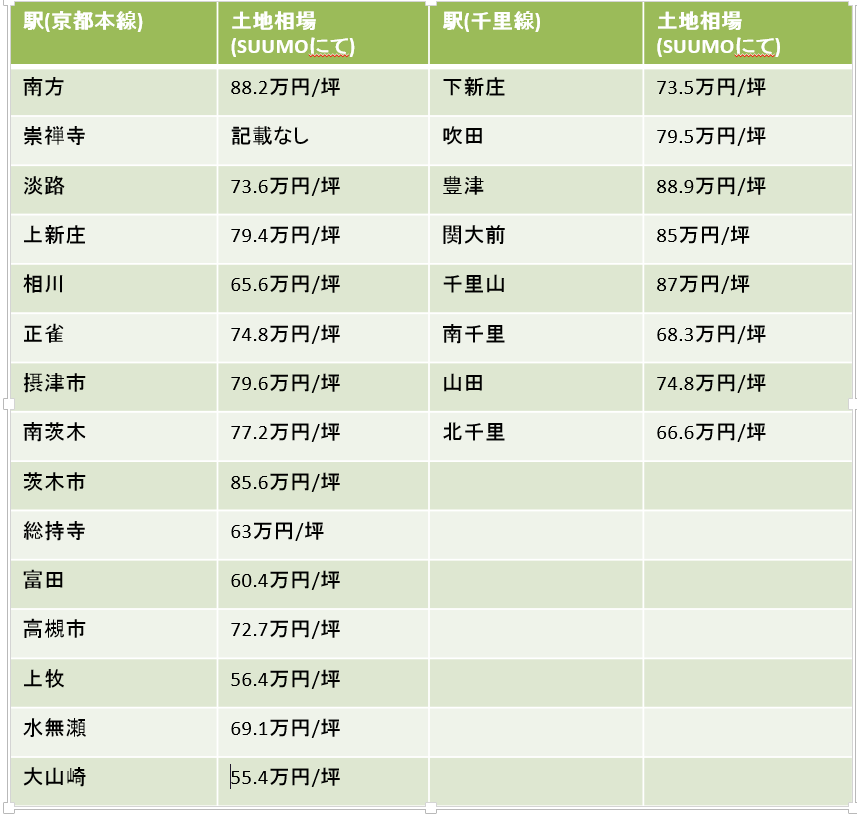JUGEMテーマ:不動産投資 以前のエントリーで、宝塚線の沿線価値(駅周辺の土地価格)を取り上げました。 http://hokusetsu2018.jugem.jp/?eid=4 本日は、満を持して(?)京都線・千里線の沿線価格をまとめてみたいと思います。 (参考までに宝塚線のものも再掲します) まずは、京都線・千里線。 90万円台 なし 80万円台 関大前、茨木市、千里山、豊津、南方 70万円台 高槻市、下新庄、淡路、山田、正雀、南茨木、吹田、摂津市 6...