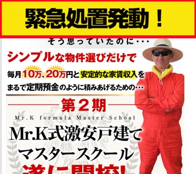 おはようございます。 細矢ますゆきです。 昨日、特別優待の販売が終了した 【 Mr.K式 激安戸建てマスタースクール 第2期 】 ですが、ひとつお知らせがあります。 というのも、 昨日の先行価格での販売が 終了に近づくにつれ、 「見逃していました・・・」 「もうちょっと考えさせてください」 「迷っているうちに特別優待が終わっていた・・・」 といったメールが大量に届いています。 私も昔は相当お金に困っていたので、 「なんとか値上げを待っても...
