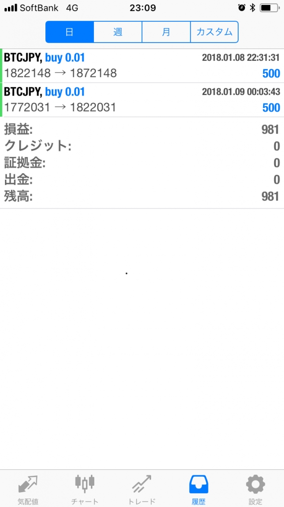 JUGEMテーマ:ビットコイン ビットコインの自動売買の1月9日の結果です 2回転で1000円の売上に 19円の経費で 981円の利益です。 2017年12月17日からのトータルで 47967円の利益です。 株とか為替と違い値動きが激しいので 多少リスクを落としてみました。 一日500〜1000円くらいの利益を狙ってみようと思います