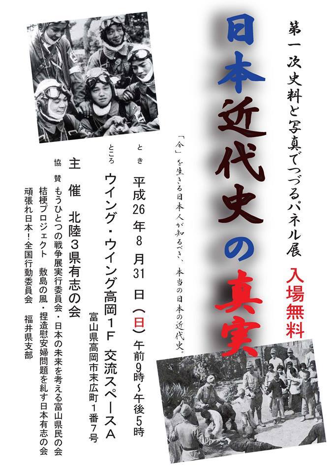 JUGEMテーマ:北陸のイベント JUGEMテーマ:日本の文化 日時 8月2日(土)〜4日(月)午前10時〜午後4時まで 場所 石川護國神社参集殿 主催 教育を考える石川県民の会 共催 大東亜聖戦大碑護持会 新しい歴史教科書をつくる会石川支部 後援 石川護國神社 石川県郷友会 北國新聞社 北陸3県有志の会 協力 捏造慰安婦問題を糺す日本有志の会 敷島の風 多数のご来場をお願い申し上げます 教育を考える石川県民の会