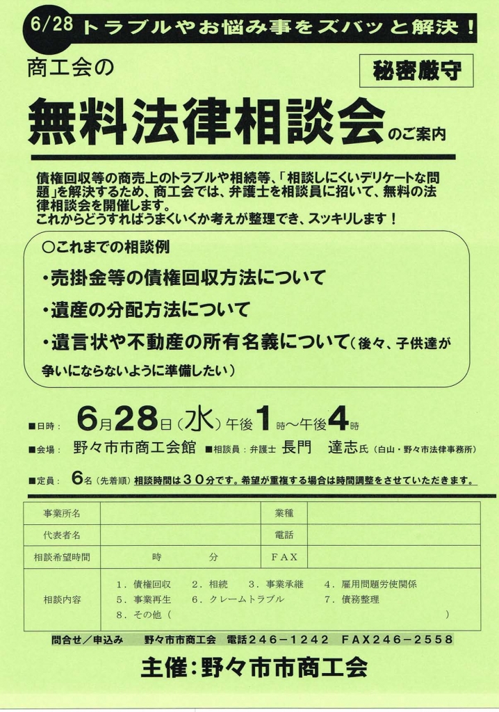 JUGEMテーマ:法律 【ご案内】 平成29年6月28日(水)、無料法律相談会を開催します。 会社経営者、個人事業主の方はこの機会に法律相談会にお越しください。 日時:平成29年6月28日(水)、午後1時から午後4時 場所:野々市市商工会 相談員:弁護士 長門達志 予約制:6名程度、1人あたり30分を予定しています。 予約先:野々市市商工会 TEL076−246−1242 【実績例】 1 売掛金の回収 取引先が売掛金約100万円を払ってくれずに...