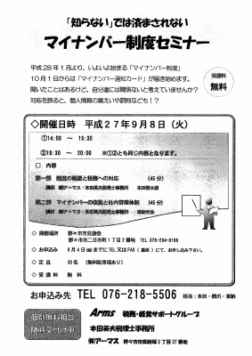 JUGEMテーマ:法律 【テーマ】 【相続円満サポートエイト】マイナンバー制度のセミナー 【質問】 マイナンバーについて教えてください。 【回答】 1 相続円満サポートエイトとは? 『相続円満サポートエイト』は、石川県の 税理士・弁護士・司法書士・社労士・不動産鑑定士など 8名の専門家が相続の悩みにトータルサポートします。 相談は、もちろん無料です。 予約の電話は:076−249−8553 2 マイナンバーについて教えてください。 マイナンバーのセミナー(勉強会)を、次の日程で開催します。 ...