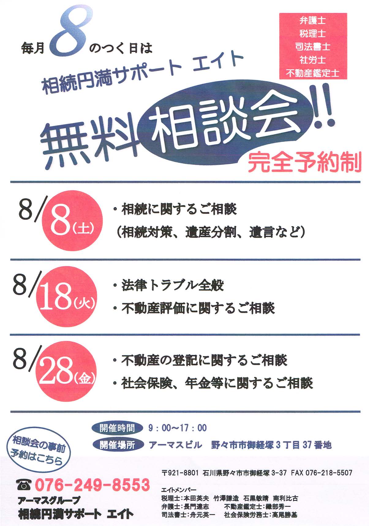 JUGEMテーマ:法律 【テーマ】 【相続】相続円満サポートエイトの無料相談会(8月)【税理士・弁護士等が一緒に解決】 【質問】 相続円満サポートエイトの無料相談会の日程を教えてください。 【回答】 1 相続円満サポートエイトとは? 『相続円満サポートエイト』は、石川県の 税理士・弁護士・司法書士・社労士・不動産鑑定士など 8名の専門家が相続の悩みにトータルサポートします。 相談は、もちろん無料です。 予約の電話は:076−249−8553 2 相続サポートエイトの相談会の日程は? 相続サポー...