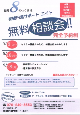 JUGEMテーマ:法律 【テーマ】 【相続】相続円満サポートエイトの無料相談会(9月)【税理士・弁護士等が一緒に解決】 【質問】 相続円満サポートエイトの無料相談会の日程を教えてください。 【回答】 1 相続円満サポートエイトとは? 『相続円満サポートエイト』は、石川県の 税理士・弁護士・司法書士・社労士・不動産鑑定士など 8名の専門家が相続の悩みにトータルサポートします。 相談は、もちろん無料です。 予約の電話は:076−249−8553 2 相続サポートエイトの相談会の日程は? 相続サポー...