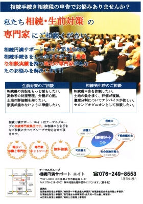 JUGEMテーマ:法律 【テーマ】 【相続】相続円満サポートエイトの活動(1)【税理士・弁護士等】 【質問】 相続円満サポートエイトの活動を教えてください。 【回答】 1 相続円満サポートエイトとは? 『相続円満サポートエイト』は、 税理士・弁護士・司法書士・社労士・不動産鑑定士など 8名の専門家が相続の悩みにトータルサポートします。 相談は、もちろん無料です。 電話:076−249−8553 2 相続円満サポートエイトの活動(セミナー・説明会) (1)平成26年10月16日(木)野々市交遊舎...