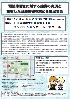 だいぶ寒くなって、冬らしくなってきましたが、いかがお過ごしでしょうか 風などにはくれぐれもお気を付けを・・・ さて本題ですが、12月4日に市民集会をやります 学生の方や一般の方もお気軽にご参加ください 『司法修習生に対する給費の実現と充実した司法修習を求める市民集会』 司法修習生とは、裁判官・検察官・弁護士になるために、司法試験に合格した後に1年間平日フルタイムで司法の現場での実務研修が課される人を言います。 この司法修習生には、2011年までは実務研修に専念させ...