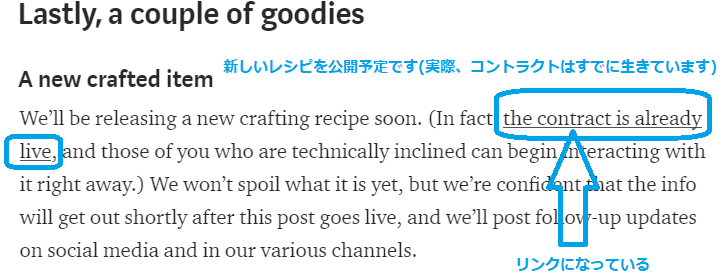 JUGEMテーマ:仮想通貨 えなこいんです。分散型RPGイーサクラフトの 前回書いた最新情報の翻訳は読んでいただけたでしょうか?? その中で最後の方に気になることが書いていました。 今回は、そこでほのめかされていた新レシピを探してみます。 ↓ 謎のリンク: https://etherscan.io/address/0x96714c669f8e3cd296a767b3ed5ec83e36bc63c3 イーサスキャンのアドレスのようです。 開いてみました。 ↓ これだけだと、何かわからなかったので、さら...