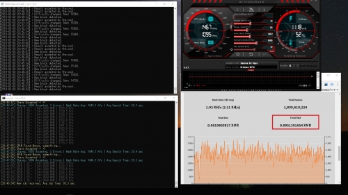 JUGEMテーマ:仮想通貨 ついに0.1モレロをゲットした(手数料天引き) これから財布に移す。 このペースと現在のレートで行くと、 0.3xmr/month=¥6,000/month, 6月末までに1.5xmr/5month =¥30,000/month 3月からGPU増設できたら0.5xmr/month= ¥10,000/month 原価(電気料金)は測定していないが、来週あたりワットモニターが来たら測れる予定。 マイニングソフトの性能は、 左上はCPU-miner(xmr-stak-cpu)で現在おおよそ500H/s (Ryzen7 1700) 左下はGPU-miner(...
