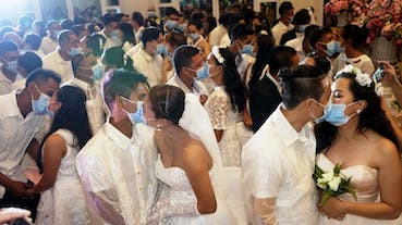 JUGEMテーマ:国際社会 220組、新型コロナで感染対策:フィリピン中部バコロド市で毎年恒例の市主催の合同結婚式が26日までに開かれ、参加した220組のカップルが新型コロナウイルス対策のためマスク越しに誓いのキスを交わした。地元メディアが報じた。結婚式は20日に開催。マスクは市が配布し、参加者には健康調査票の記入や体温測定を求めた。会場の市役所ロビーには、伝統的な正装や純白のドレス姿で、顔の下半分をマスクで覆った新郎新婦がずらりと並んだ。市当局者は感染防止のため、やむを得ない措置だったと説明。新郎の...
