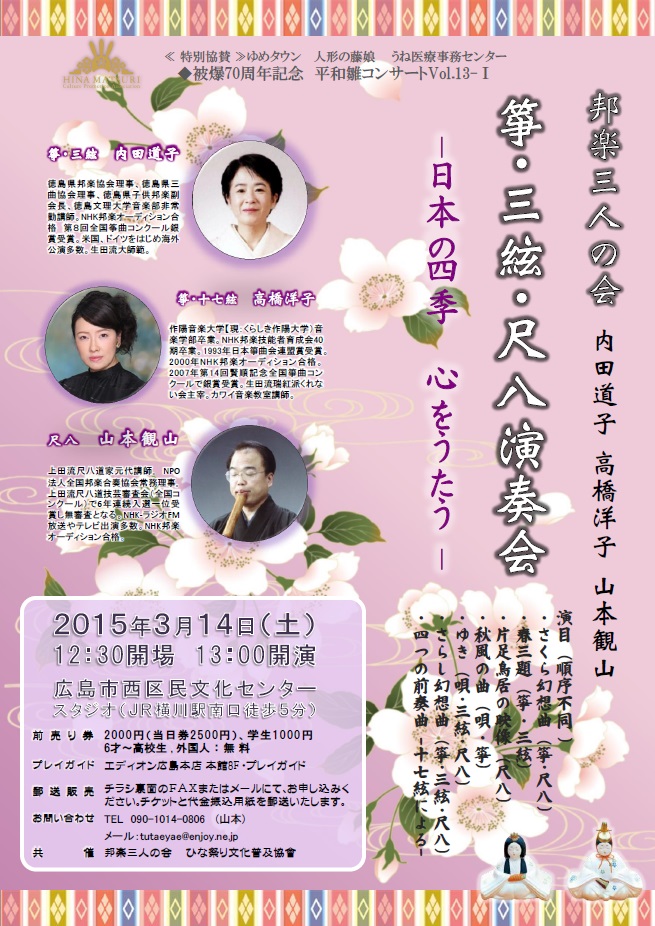 JUGEMテーマ:和楽器の魅力 JUGEMテーマ:ひな祭りの楽しみ方 JUGEMテーマ:世界平和 2015年 平成27年の春 ひな祭りイベントです。 3月14日から15日まで 場所はすべて西区民文化センター・スタジオです。 チラシPDFは下記のページから選択してください。 http://hina-matsuri.jp/introduction_work.html#mokuteki