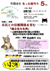 JUGEMテーマ:地方議会 1.タイトル しぎかいカフェ5th「市民との信頼関係を育む“議会基本条例”」 2.日時 令和2年8月1日(土) 13:30開始 3.場所 サンシップ富山501号 Tel:076-432-6141 4.講師 内山米六さん(上越市議会元議長) 5.内容 ・上越市議会が取り組んだ背景 ・策定の手法及び条例の構成と特徴 6.主催 富山の地方自治を考える会 090-2378-2827(松原) 2020.8.01(土)の他のニュース >>