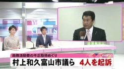 JUGEMテーマ:地方議会 1.KNB:「KNB」→「ニュース」→「ニュースバックナンバー」→「4月9日(火)」 ・富山市政務活動費不正取得 詐欺罪で起訴 >> ・村上市議「辞職は考えていない」 >> ・政務活動費不正 その経緯は >> ・政務活動費問題 今後の展開 >> 3.NHK:「NHKオンライン」→「各地のニュース」→「富山」を選択 ・村上元議長ら4人を在宅起訴 >> 6.チューリップ:「チューリップテレビ」→「ニュース」→「04月09日(火)」 ・起訴を受けて… 元議長の村上被告「理解...