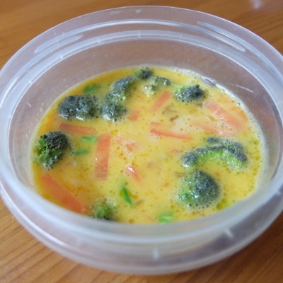 JUGEMテーマ:あさイチ 今朝のあさイチは保存容器の使いこなしがテーマでした 目にとまったのは、保存容器で作る卵焼きです 卵2個に人参、ブロッコリー、塩少々 時々かきまぜて2分半 なんと色鮮やかな切り口! 簡単だし、いろんな野菜が入れられて、これはいい! ただ、味は・・・ちょっと・・・ ぼそぼそ感が・・・ 原因は、加熱時間が長すぎたのと、 これは和風なのか洋風なの...