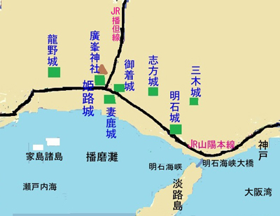JUGEMテーマ:NHK大河ドラマ「黒田官兵衛」官兵衛の父:職隆(もとたか)は御着城主:小寺政職(まさもと)の家臣として姫路城代として仕えており、母:岩は、播磨国明石郡枝吉城主の明石宗和(あかしそうわ)の娘でした。姫路城と龍野城の赤松政秀との間で小競り合いがあり、そんな時に、萬吉(官兵衛)は、母の病に効く薬草を取りに龍野城の領内に入り、つかまりましが、父:職隆が赤松氏とかけあって救出します。当時は、姫路城は、御着城の支城としての位置付でした。また、龍野城は、山頂に城があって名門赤松氏が治めていました...