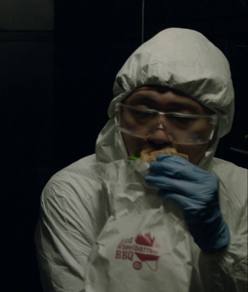 いっつもなんか食ってるコイツ、ナイスキャラですよね。 私じゃないですよ!そっくりじゃねぇかなんて話もありますが... あ、"MR. ROBOT"のことね。 で、紙袋のロゴをよく見ると、 "Red Wheelbarrow BBQ"! シーズン2の最後の方にメニューが出てきたファストフードのロゴ。 なんですがなんと! ニューヨークの街角にワゴン出現!! Eコインメンバーはタダ(?)とかで、スゲーなー。 先日のEコイン発射イヴェントも盛り...