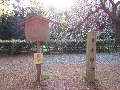 JUGEMテーマ:大河ドラマ 京都御苑の北側、今出川御門近くに五摂家筆頭であった近衛家の邸跡があります 近衛邸跡 この辺りが近衛邸があった場所です。近衛家は、五摂家の一つで、江戸時代までに多くの人が摂政や関白になっています。かつてはこの庭園の池の西側に大きな屋敷があり、御所炎上の際は仮の皇居ともなりました。 池のほとりは、昔から糸桜の名所で、孝明天皇も次の歌を詠まれています。 「昔より 名にはきけども 今日みればむへめかれせぬ 糸さくらかな」(駒札より) 近...