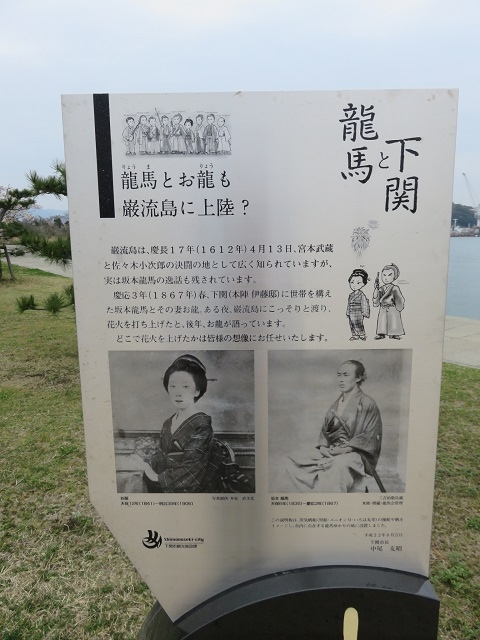 JUGEMテーマ:大河ドラマ 慶応3年(1867)春、下関(本陣 伊藤邸)に世帯を構えた坂本龍馬とお龍が、ある夜、巌流島にこっそりと渡り、花火を打ち上げたと、後年、お龍が語っています。 巌流島は、関門海峡に浮かぶ周囲約1.6kmの小さな島で、正式な島の名前は船島。 現在は、海沿いの散策道なども整備され、多くの観光客が訪れています。 慶長17年(1612年)4月13日、宮本武蔵と佐々木小次郎の決闘したことで有名ですね。 ちなみに、巌流島はアントニオ猪木とマサ斉藤が、プロレスの一騎打ちをし...