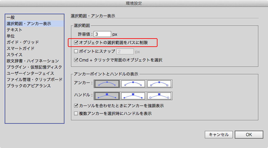 JUGEMテーマ:Adobe CS5 今回はほぼグチに近いです。 ワタクシ、Illustratorで塗り部分をクリックして選択されるのがイヤで 環境設定で「オブジェクトの選択範囲をパスに制限」にチェックをいれています。 例えば細かいパーツの背面に大きい塗りのオブジェクトがあったとき 「オブジェクトの選択範囲をパスに制限」にチェックをいれてあると 選択ツールを使って ドラッグして複数の前面にあるオブジェクトを同時に選択出来ます。 「オブジェクトの選択範囲をパスに制限」にチェックをいれいないと 最...