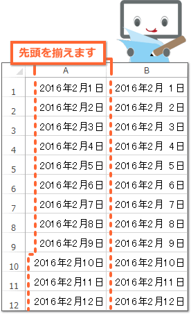 Excelのセルに日付を入力すると、月や日が1桁の場合、 日付の先頭がそろわなくなってしまいます 「セルの書式設」を設定すると、月や日の前に空白を入れて、 桁をそろえることができます 1桁の月日が入力されているセルを範囲指定して右クリックします メニューから[セルの書式設定]を選択します 上の図では2016年2月1日から2016年2月9日のセルを 範囲指定して右クリックします [セルの書式設定]画面が開きます [表示形式]タブが開いていることを確認し、 [分類]から[日付]を選び、表示したい形式を選択しま...