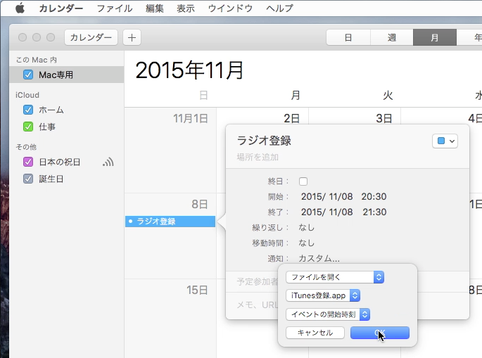 JUGEMテーマ:Macintosh 深夜ラジオが聴きたくてほぼ毎日Macでラジオを録音してまして、 それをiTunesに登録して楽しんでいますが、 iTunesに追加するときに番組によって追加するプレイリストを変えたり、 アルバム名やアーティスト名の変更・再生位置記憶・シャッフル時スキップ等の設定したり、 録音した順番に確実に追加するため、 それらの作業をしてくれるApplescriptを組んでアプリケーションにして実行しています。 そこまで自動で出来るようにしたのに、そのスクリプトを実行するのが手動では何だか少し残念で...