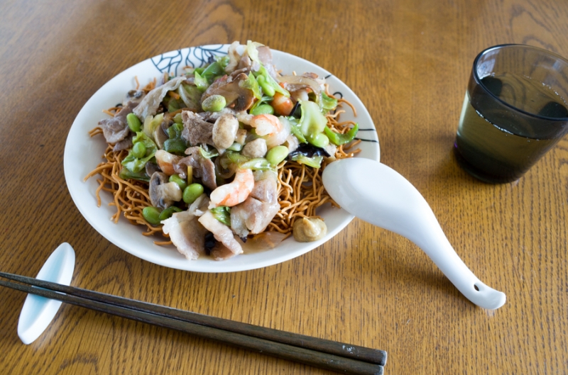 ティーマ21cmのプレートでガッツリ皿うどんパリッとした揚げ麺の食感が美味しい皿うどん、たまたま行ったスーパーで専用の麺が安かったため、衝動買いしてしまったため久しぶりに作ってみたこの料理。具材は、豚肉、海老、キャベツ、キクラゲ、枝豆、人参、タマネギ、マッシュルームと冷蔵庫にあった野菜やお肉を全て入れて、味付けはに中華のもと味覇(ウェイパァー)をベースにして、最後に、水溶き片栗粉でとろみをつけた餡を麺の上にかけました。食べるときは、個人的な好みで辛子をちょっと混ぜたり、お酢をちょっとふりかけたり...