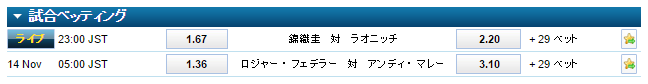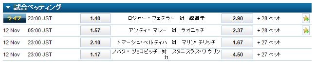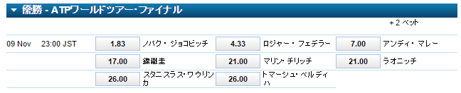 JUGEMテーマ:テニス 今年、 活躍が目立ったプロ選手といえば・・・ テニスの <strong><span style="color:#ff0000">錦織圭</span></strong>ですよね その、錦織圭が 日本人初として出場する <strong>ATPワールドツアーファイナル</strong> ブックメーカーから 優勝者と各ゲームのオッズが発表されています。 優勝の1番人気はノバク・ジョコビッチ 錦織は、<strong>17倍</strong>と4番人気ですから 評価は上々でしょう! 対...