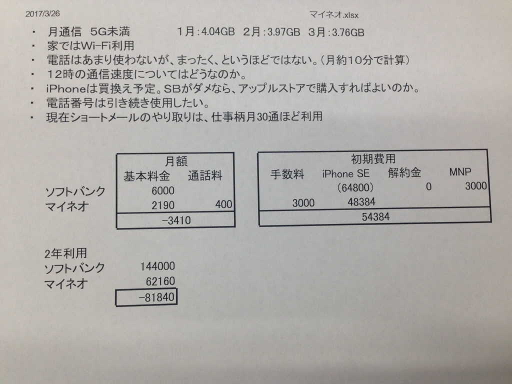 JUGEMテーマ:携帯電話スマートフォン 最近周りで、携帯電話を買い替える人が多くて、 「新しいのはいいぞぉ〜」と推してこられるのです。 ちなみに私はiPhone5をソフトバンク契約で使っています。 彼氏もソフトバンクで先月iPhone7に機種変。 実質無料?月々割り?かなんかで、2年で機種変すると大変お得だそうで。。 え、私、4年使ってますけど? お金の管理をしていて常々思うのは、携帯代金の高さ。 ネットやゲーム、LINEはしたりするけど、電話はあんまりしないし、 ...